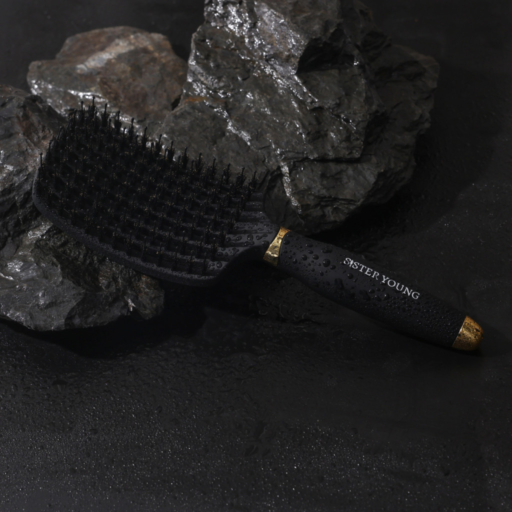 Természetes vaddisznó sörték + antisztatikus nylon tüskék masszázs hegyekkel – gyengéden kibontja, simítja és masszírozza a fejbőrt.