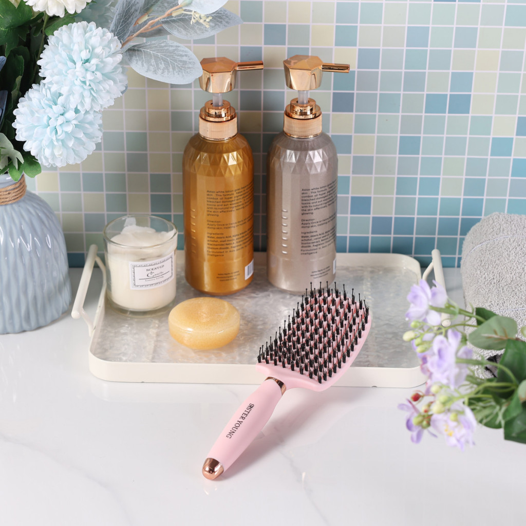 Természetes vaddisznó sörték + antisztatikus nylon tüskék masszázs hegyekkel – gyengéden kibontja, simítja és masszírozza a fejbőrt.